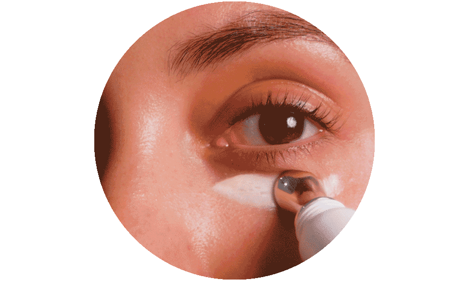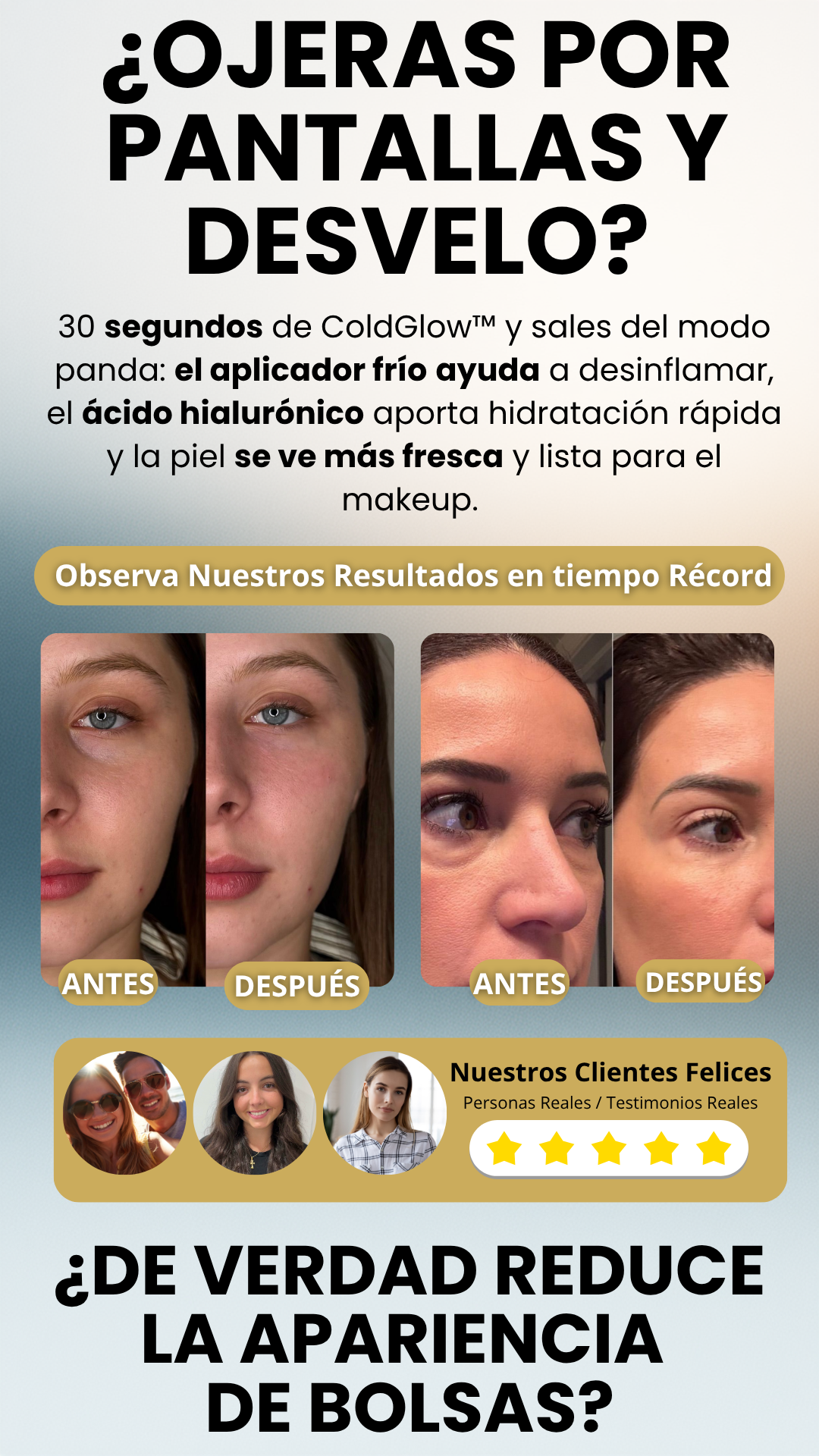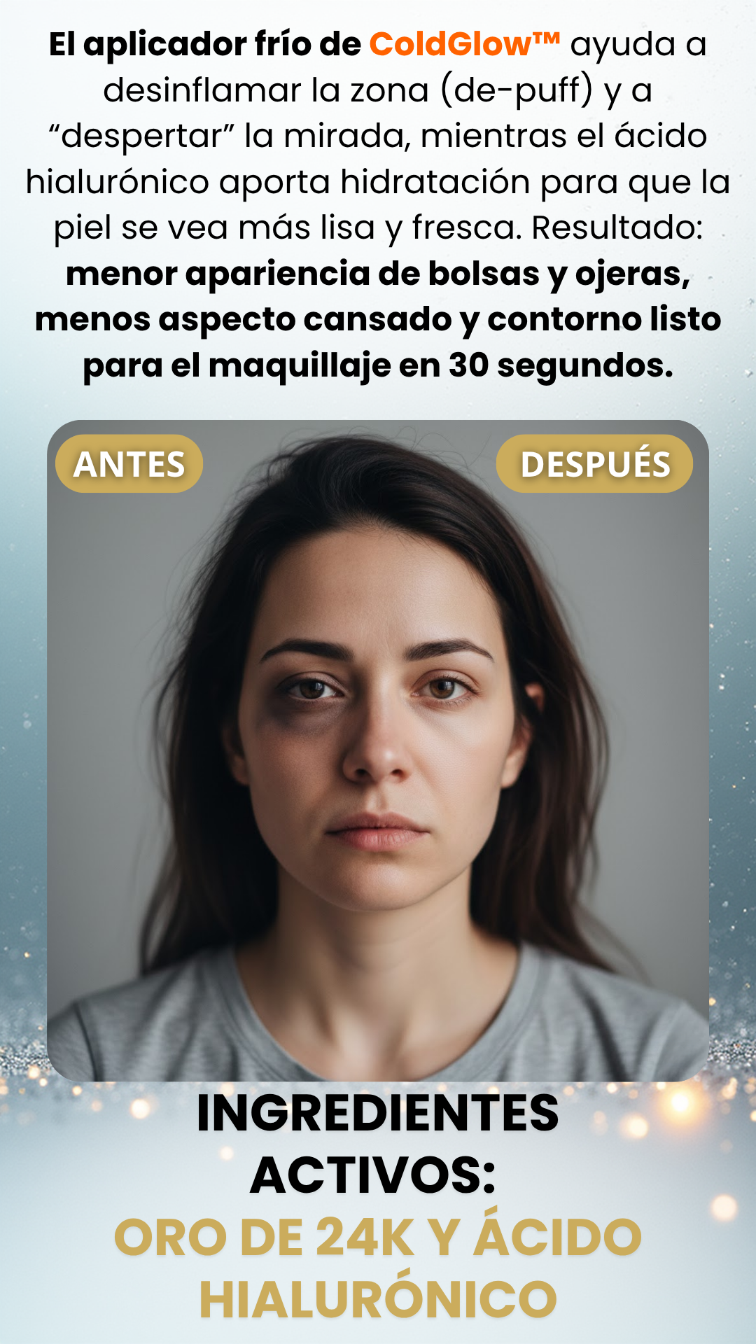 Sí. El aplicador metálico frío ayuda a desinflamar al contacto, mejorando la circulación y reduciendo la hinchazón de bolsas u ojeras al instante. Es ideal para usar incluso antes del maquillaje.