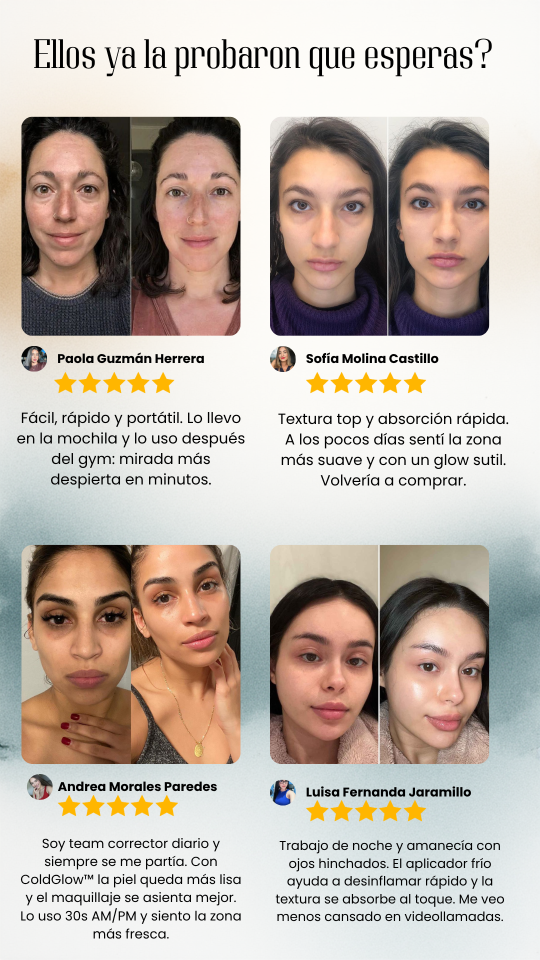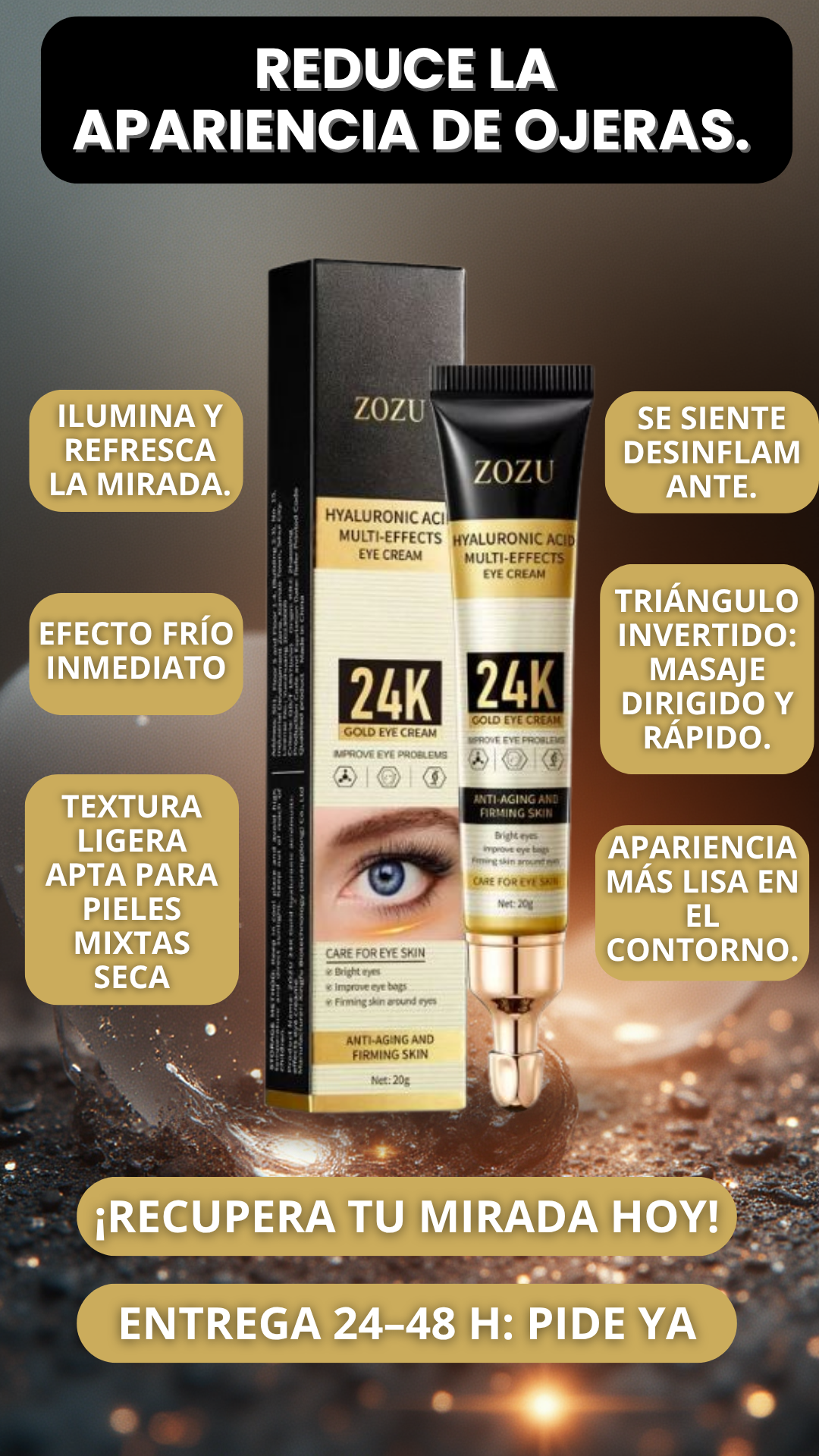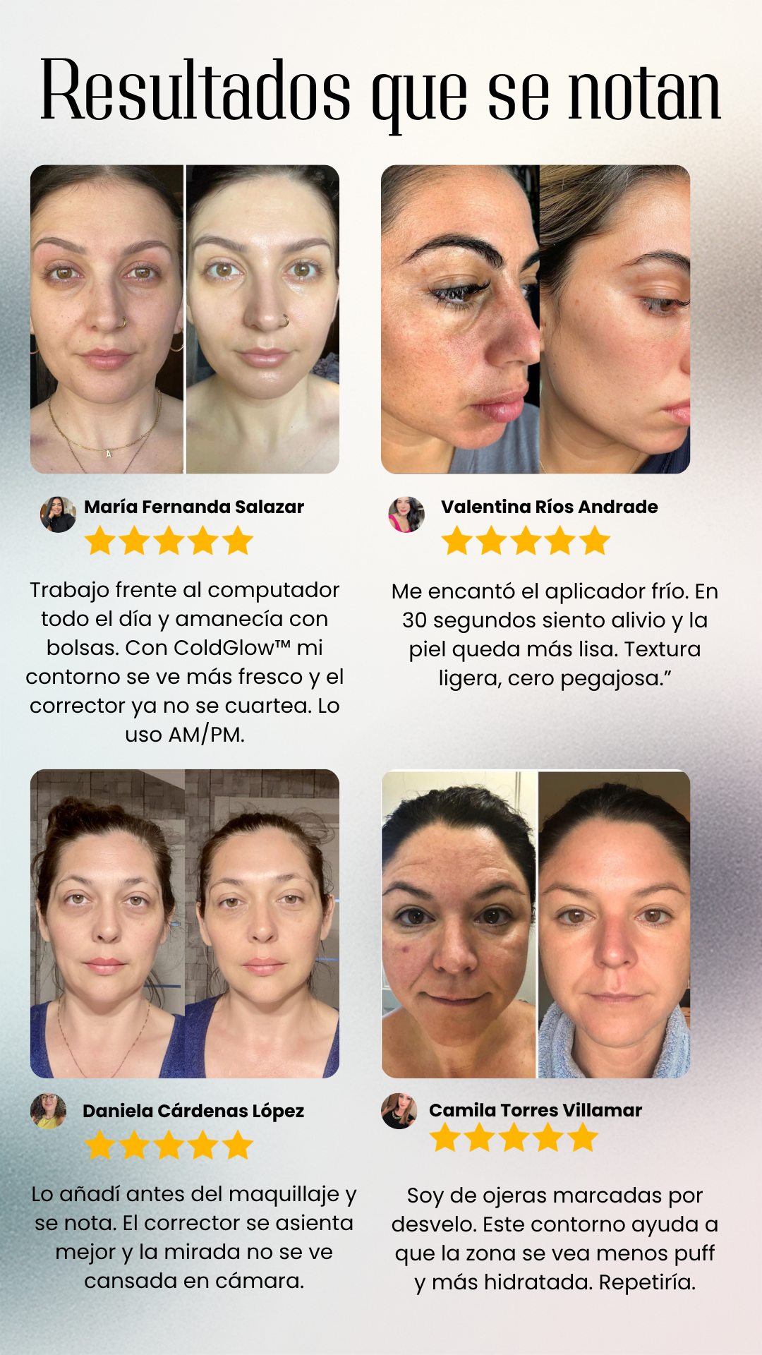 Sí. El aplicador metálico frío ayuda a desinflamar al contacto, mejorando la circulación y reduciendo la hinchazón de bolsas u ojeras al instante. Es ideal para usar incluso antes del maquillaje.
