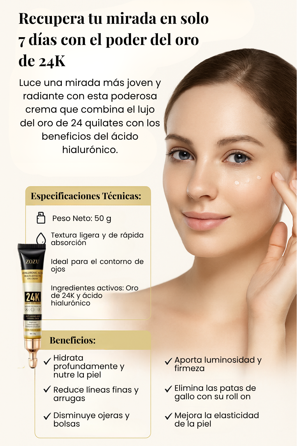 Sí. La fórmula con ácido hialurónico y oro de 24K ha sido diseñada para ser suave y apta para todo tipo de piel, incluyendo pieles sensibles. No contiene fragancias ni ingredientes irritantes.